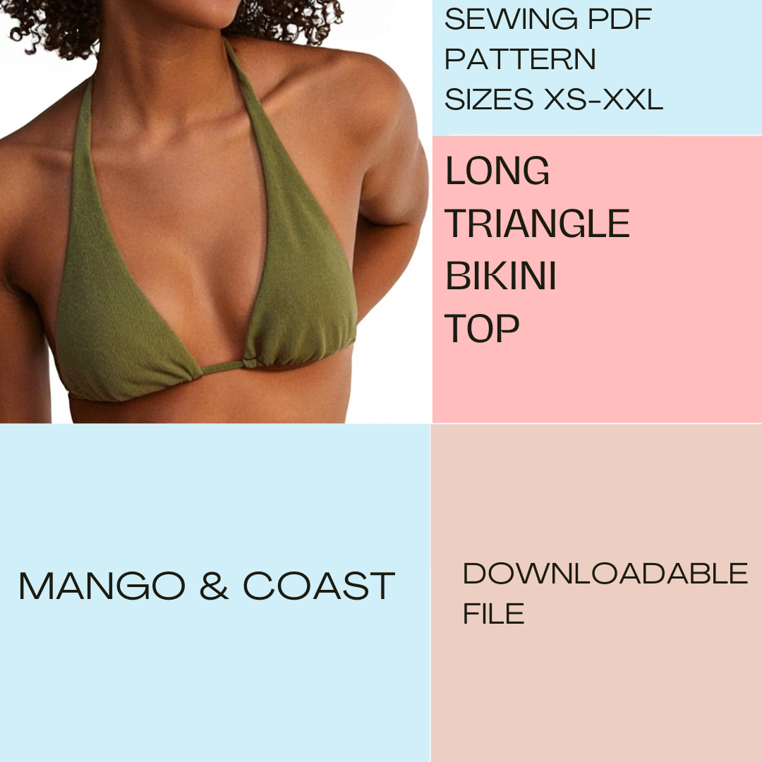 DIY Swimwear | Long Triangle Halter Bikini Top | pdf sewing pattern | Reversible Non-Reversible | Swimsuit, Women’s Bathing Suit XS–XXL